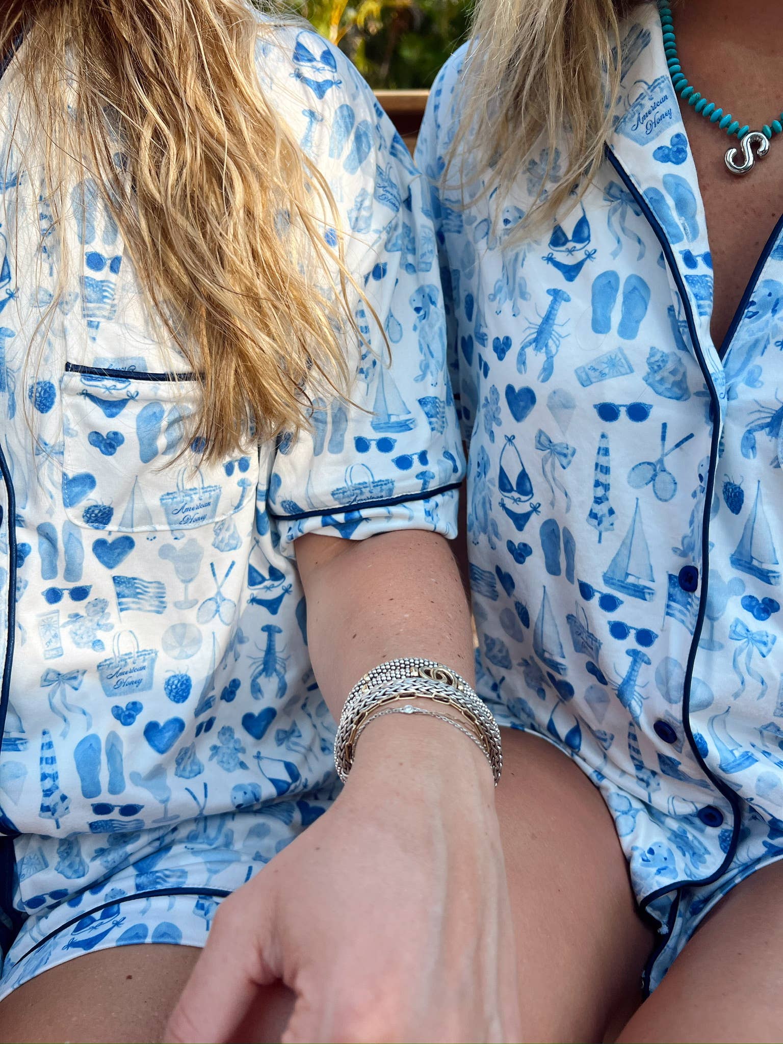 Buttery- Soft Bamboo Pajama Sets now available Blue and white icon print - perfect for your summer and beach loungewear! Sleep Top: Notched Collar, Front Button Closure, Short Sleeves with green polka dot Sleep Shorts: Elastic Waistband with Drawstring Tie, Hip Pockets, + Relaxed Fit Model is wearing a size Medium Designed with love by our team in Arkansas, made in China! Care Instructions: Gentle Wash Cold, Inside Out, Tumble Dry Low Materials: 95% Bamboo Viscose, 5% Spandex
