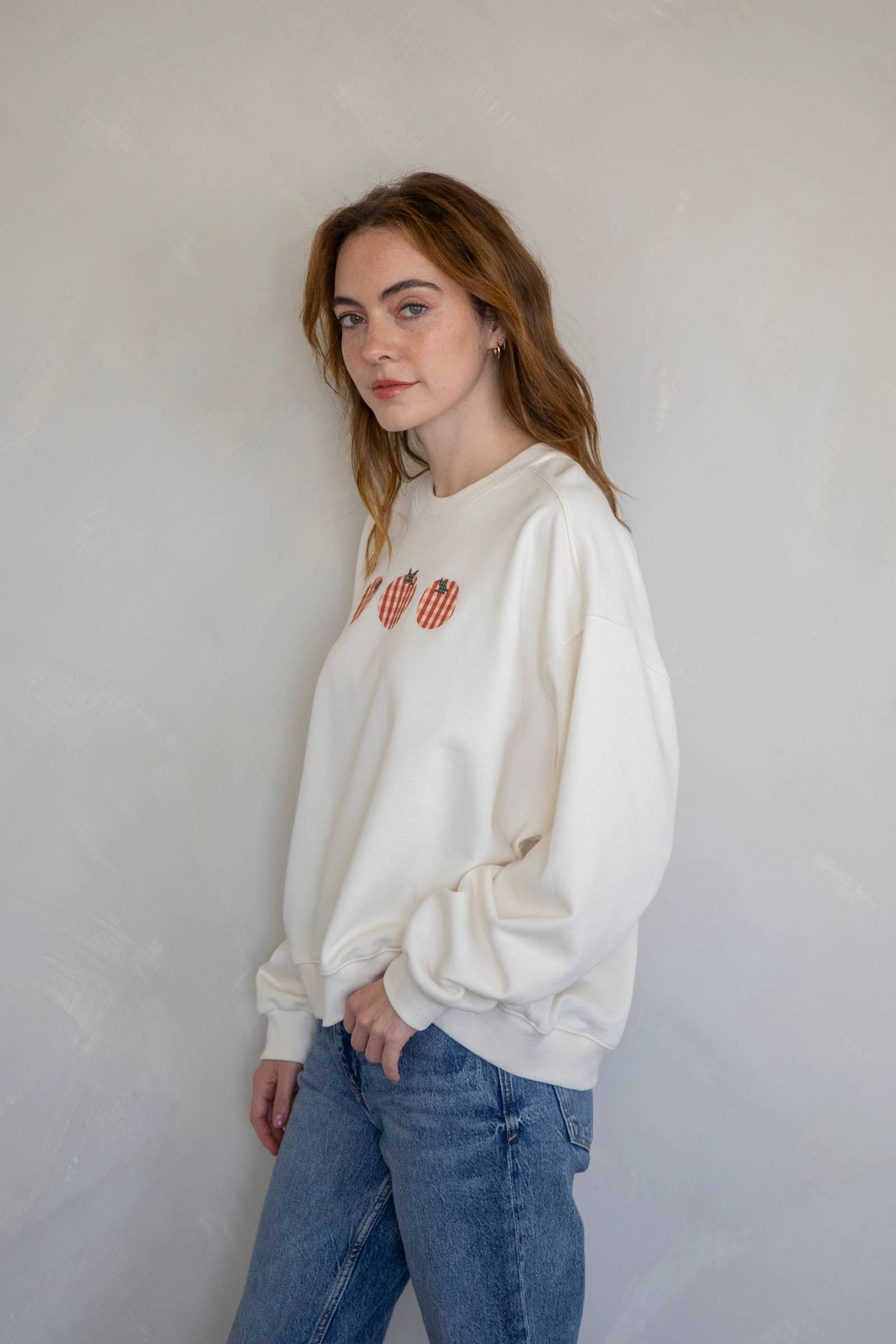 Bring a little charm to sweater weather with this oversized cream crewneck, featuring the sweetest gingham-print tomatoes. This soft and cozy staple is perfect for crisp fall days, whether you’re apple picking, cooking up something warm at home, or simply curling up on the couch. With its playful design and effortless fit, it’s the ultimate sweater for tomato girls and autumn lovers alike.