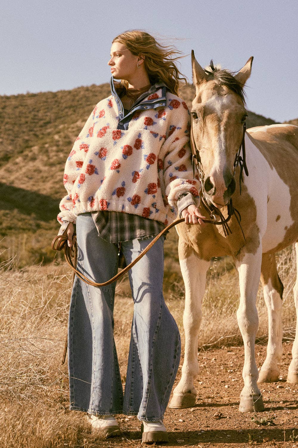 A floral-print sherpa fleece pullover jacket with the following features: High denim collar. Half-zip front closure with denim snap placket. Long sleeves with elastic cuffs. Drop shoulder. Side pockets. Elastic hem. Lined. Relaxed fit.