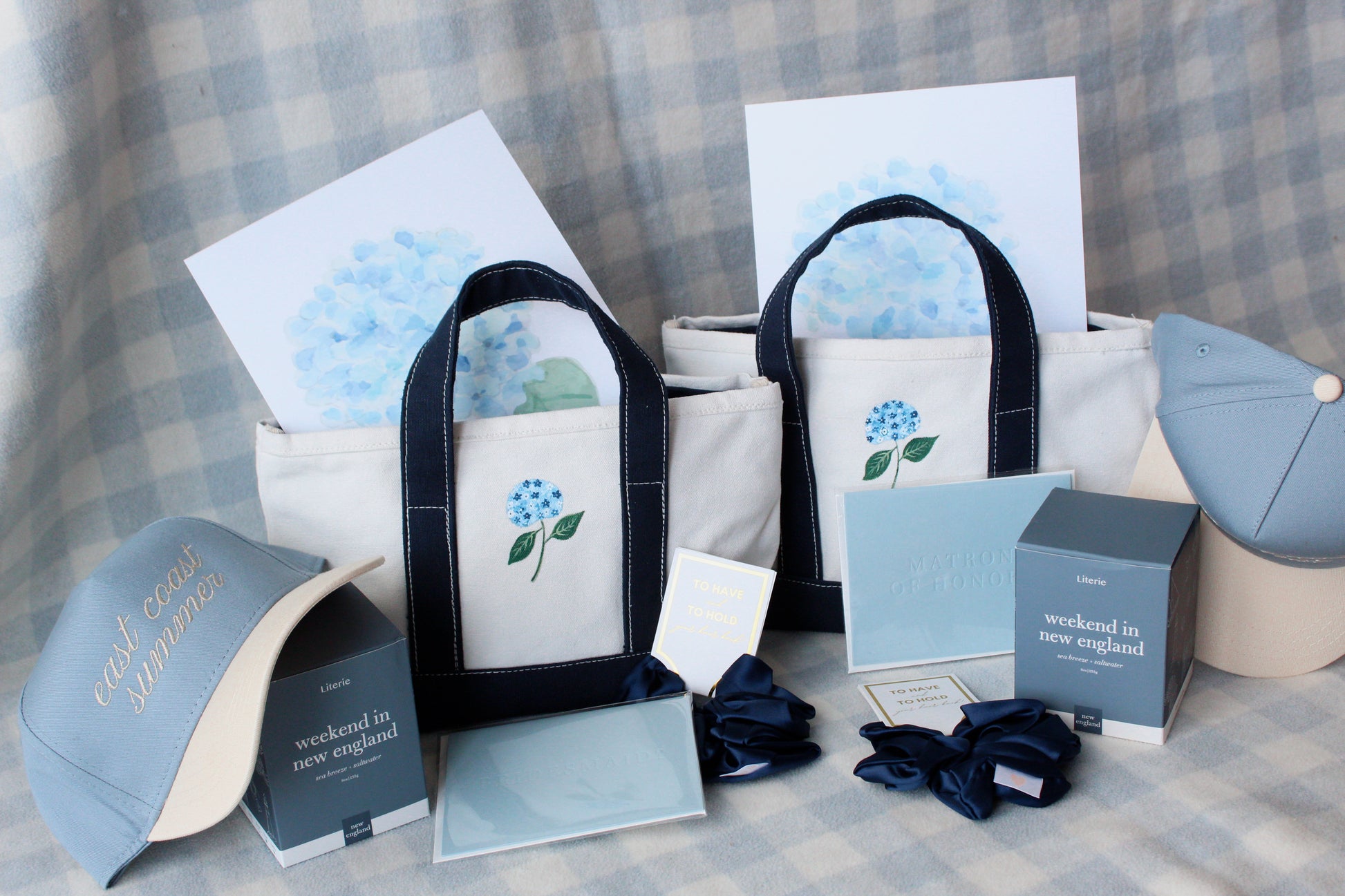 Small totes hand painted with a blue hydrangea. The perfect coastal accessory. Can fit phone, wallet, keys, sunglasses