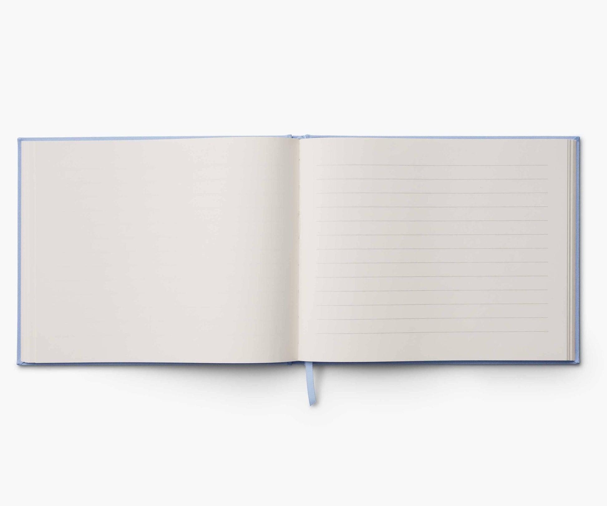 A one-of-a-kind keepsake, our new embroidered guest book is a large hardcover journal with 144 interior pages, half lined and half blank so guests can write a note, add a sketch, or paste a photo. The cover is wrapped in book cloth and embroidered with dotted Hydrangea florals and metallic gold accents. A grosgrain ribbon bookmark saves your place.