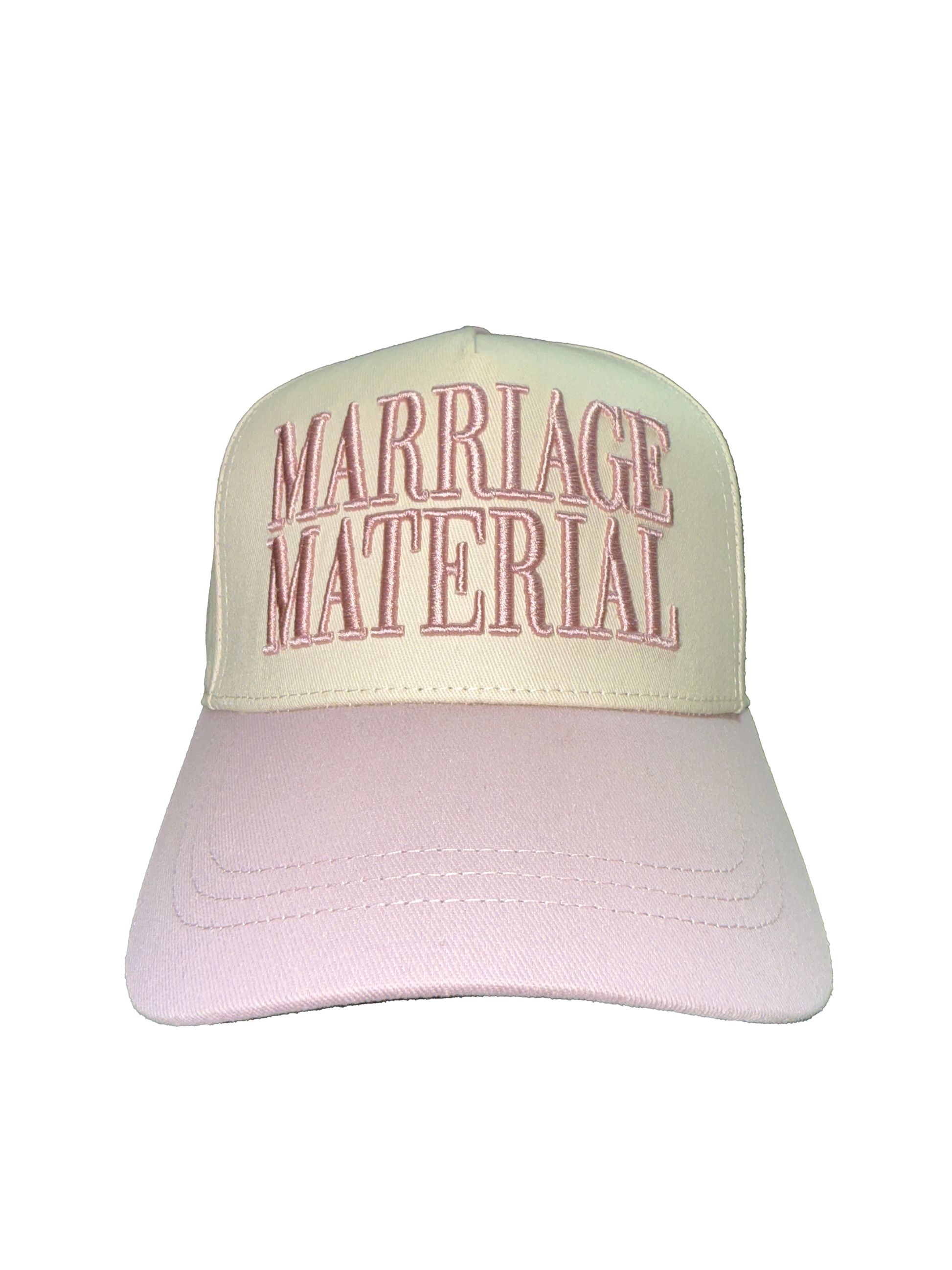 This dreamy lavender detailed trucker makes a statement in soft tones. Our signature 'Marriage Material' embroidery keeps it playful, perfect for a pastel palette bachelorette weekend.