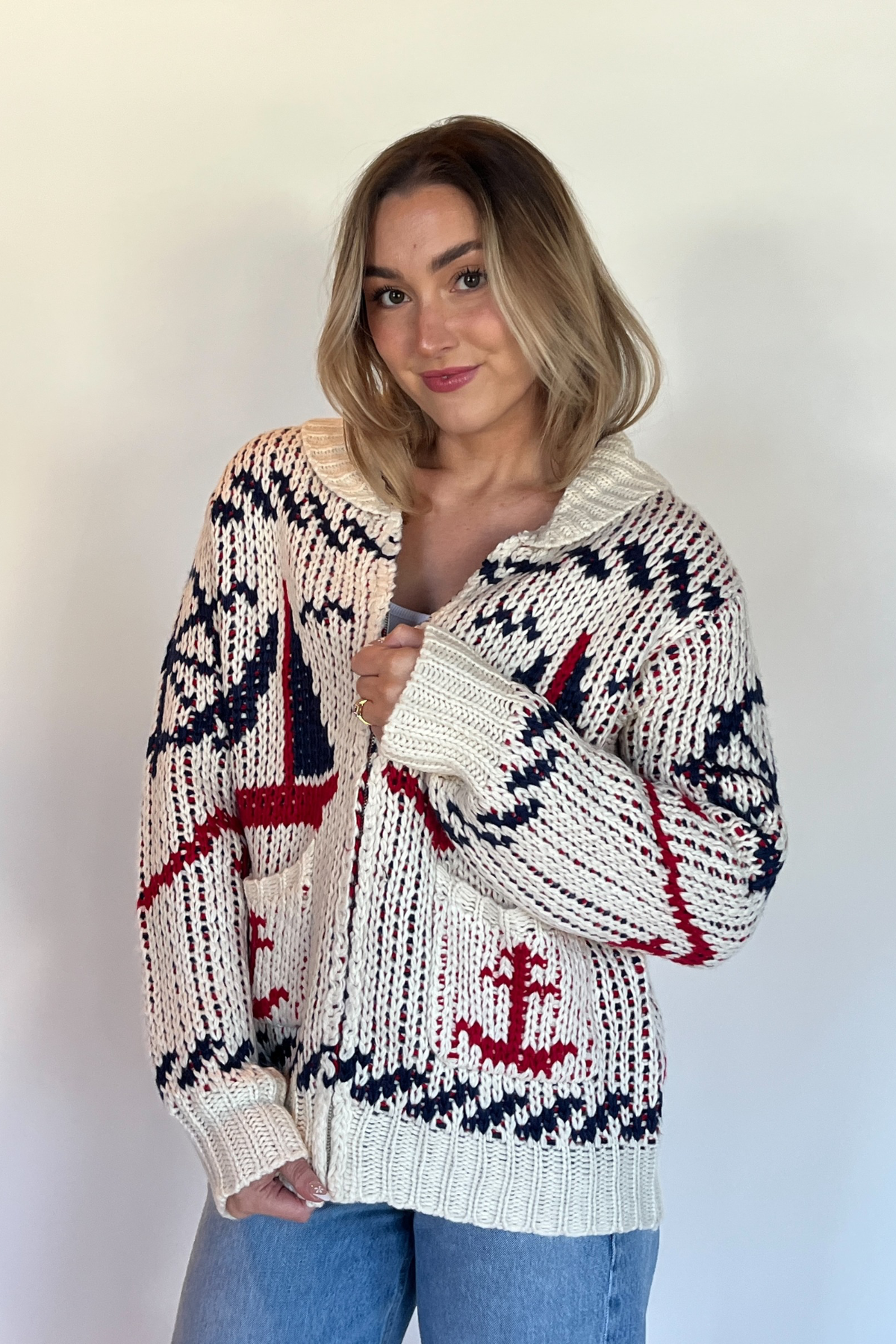 Crafted in a thick knit, this zip-up sweater features a cute collar and coastal-inspired motifs woven throughout for that classic seaside feel. The oversized fit gives it a relaxed, borrowed from grandma’s closet silhouette that layers perfectly over tees, button-downs, or lightweight dresses.
