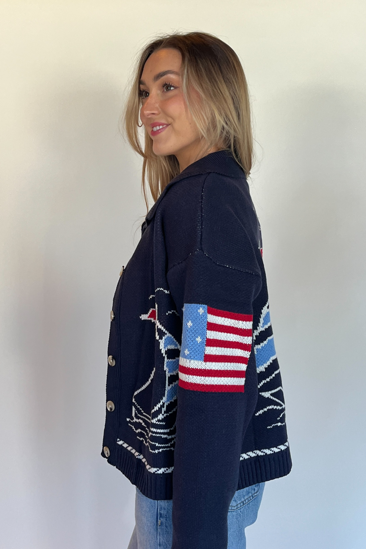 Designed with a more structured fit while still offering a touch of slouch, this cardigan strikes the perfect balance between polished and relaxed. It features oversized statement buttons so you can wear it open and easy or closed for a more tailored look. A classic collar adds to its refined silhouette, while sailboat details on the front and back bring that effortless seaside charm.